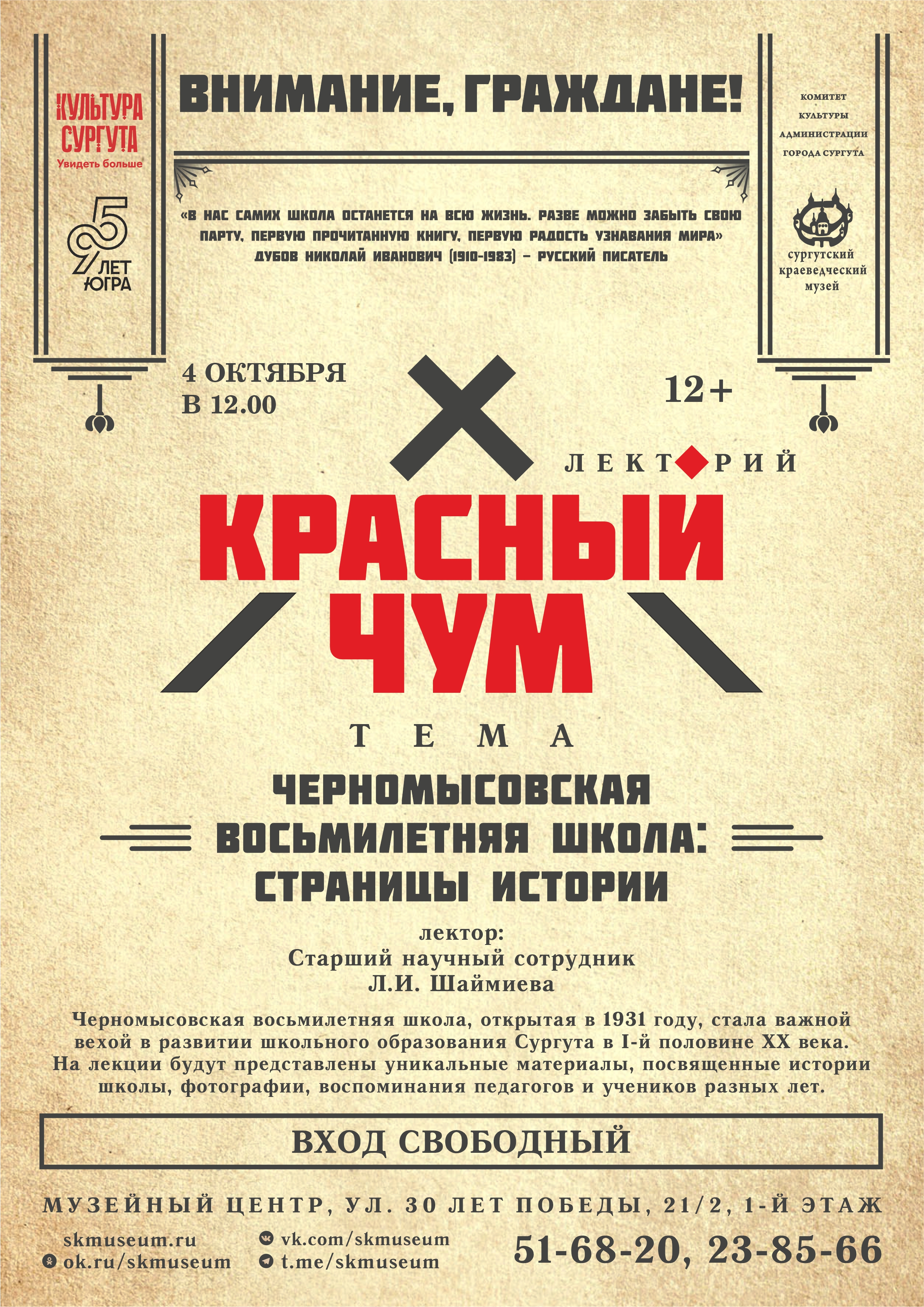 Встречи лектория «Красный чум» проходят в Музейном центре (ул. 30 лет Победы, 21/2) каждую первую субботу месяца в 12:00.