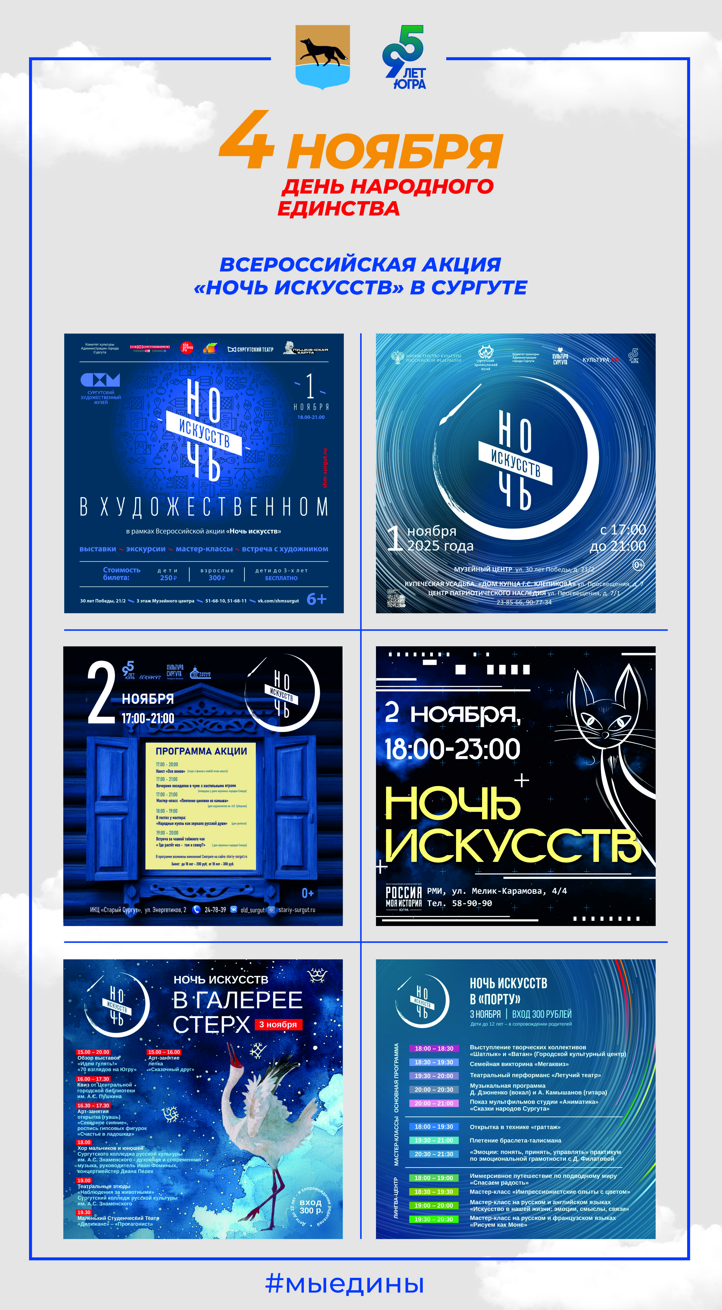 Главное праздничное событие пройдет в большом зале Сургутской филармонии, где 01 ноября 2025 года в 16.00 часов состоится торжественный вечер, посвященный Дню народного единства, в котором примут участие солисты и творческие коллективы города. Билеты в кассе МАУ «Сургутская филармония», ул. Энгельса, 18. Режим работы: 09.00-20.00 обед 14.00-14.40. Количество пригласительных ограничено.