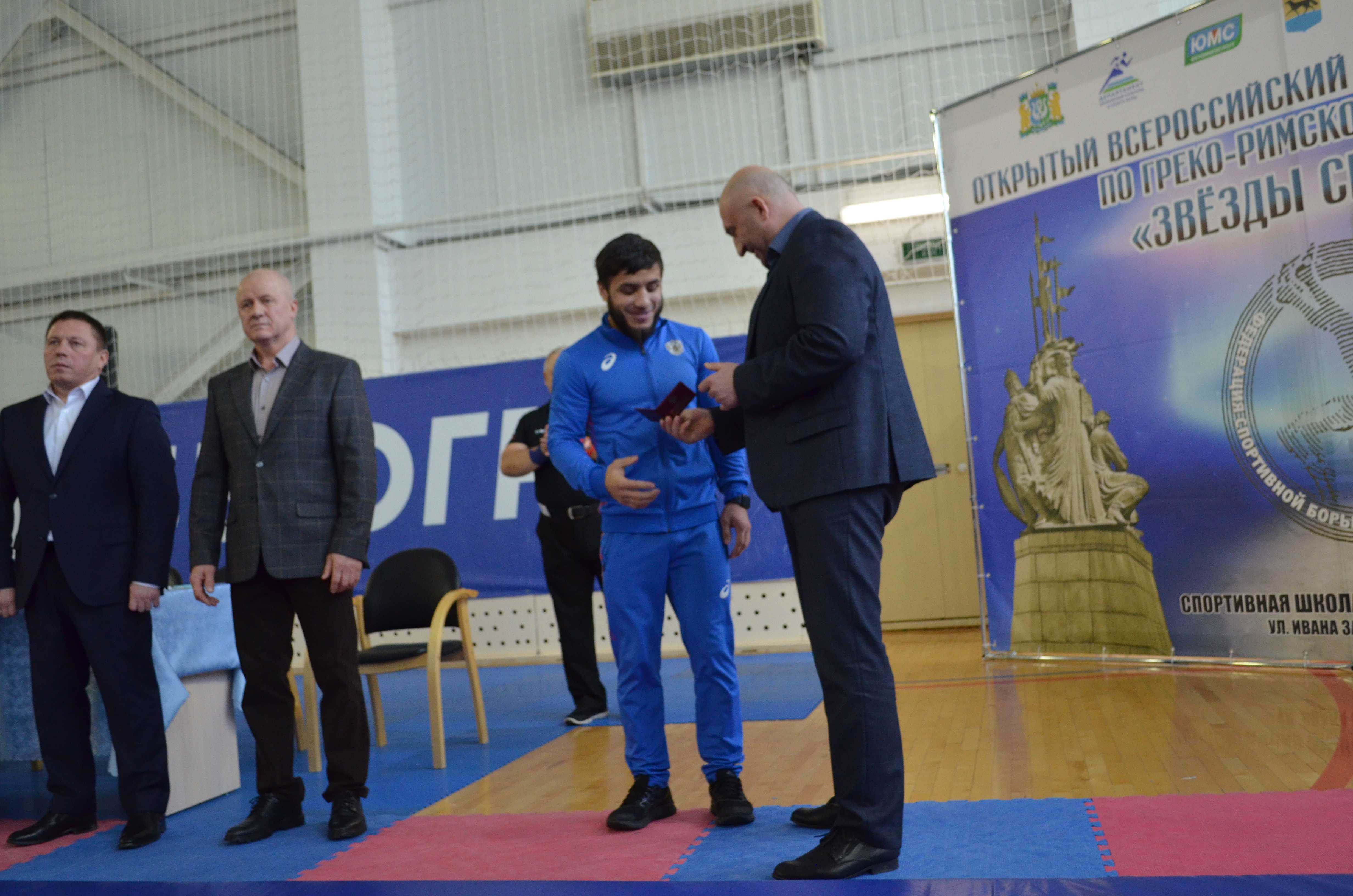 На торжественной церемонии открытия турнира Владимир Витальевич Мазуренко вручил удостоверение и номерной знак Мастера спорта России международного класса по спортивной борьбе спортсмену СШОР №1 Рахману Тавмурзаеву.