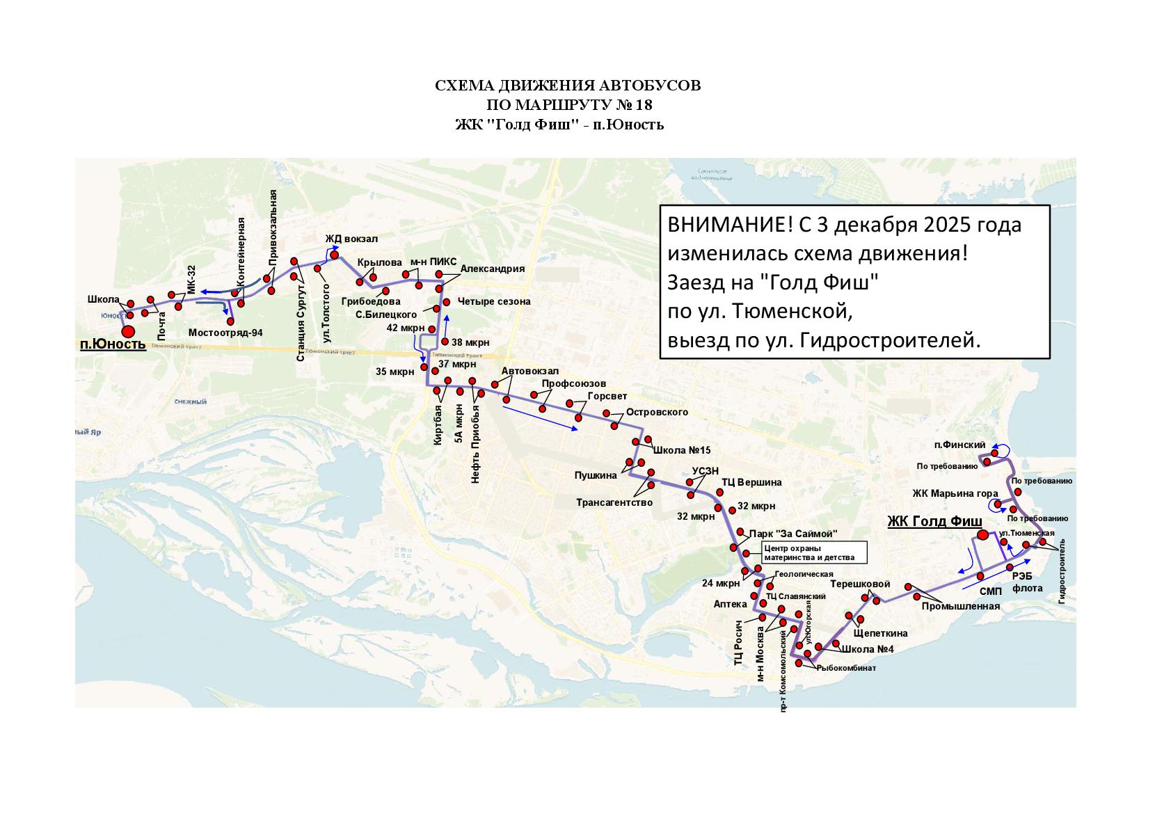 Администрация города Сургута информирует вас о том,  что в связи с открытием улицы Тюменской после её реконструкции изменилась схема движения городского общественного транспорта по маршруту № 18. Автобусы выполняют заезд в ЖК «Голдфиш» по ул. Тюменской, выезд – по ул. Гидростроителей.