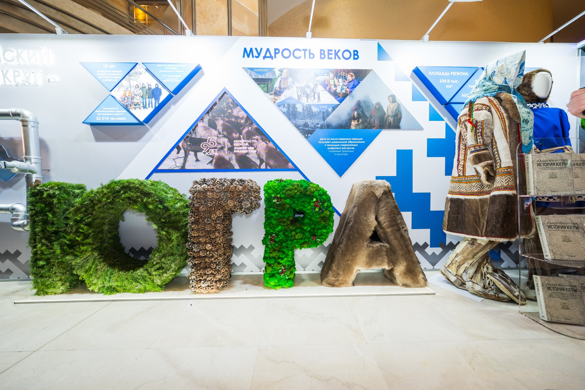 Перед началом торжества гости ознакомились с выставочной экспозицией в холле КТЦ. Выставка демонстрирует главные достижения Югры — от масштабных инфраструктурных проектов до ярких культурных событий.