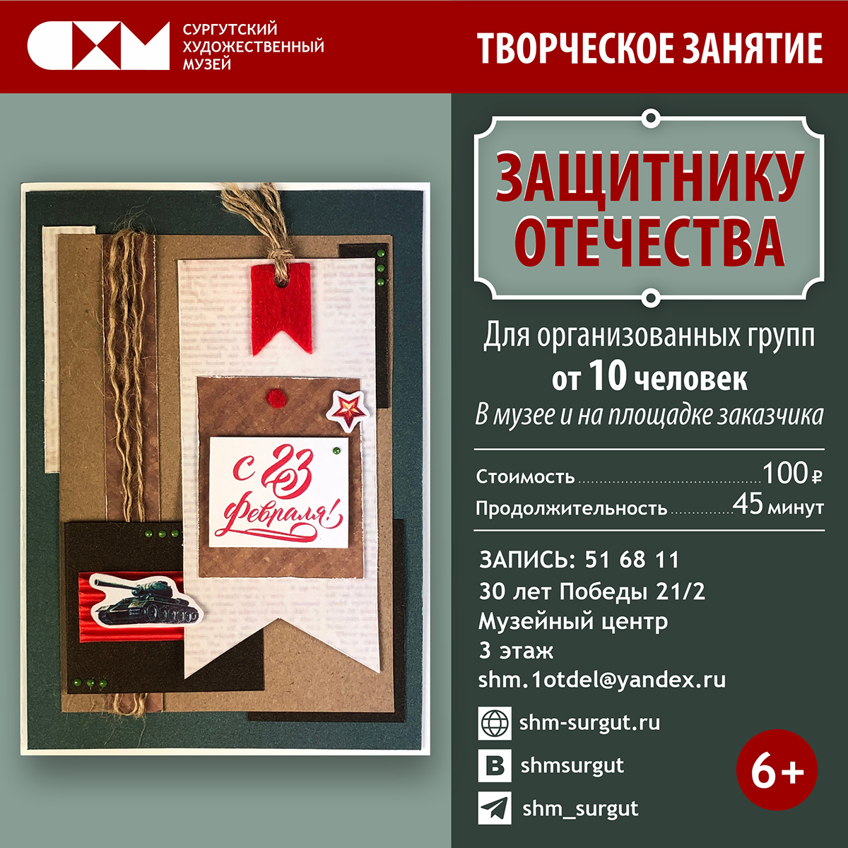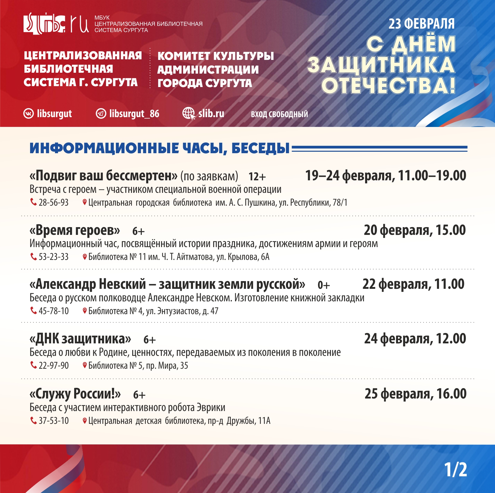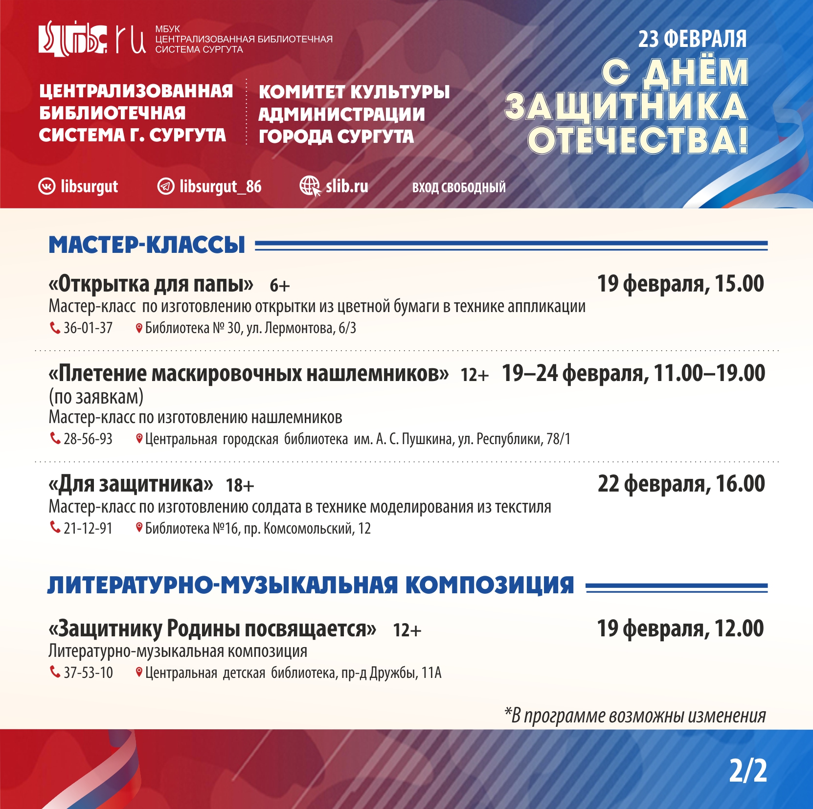 В рамках празднования Дня защитника Отечества в городе Сургуте запланированы концерты, спектакли, мастер-классы, экскурсии, спортивные соревнования. С подробной информацией о мероприятиях можно ознакомиться в приложении:
