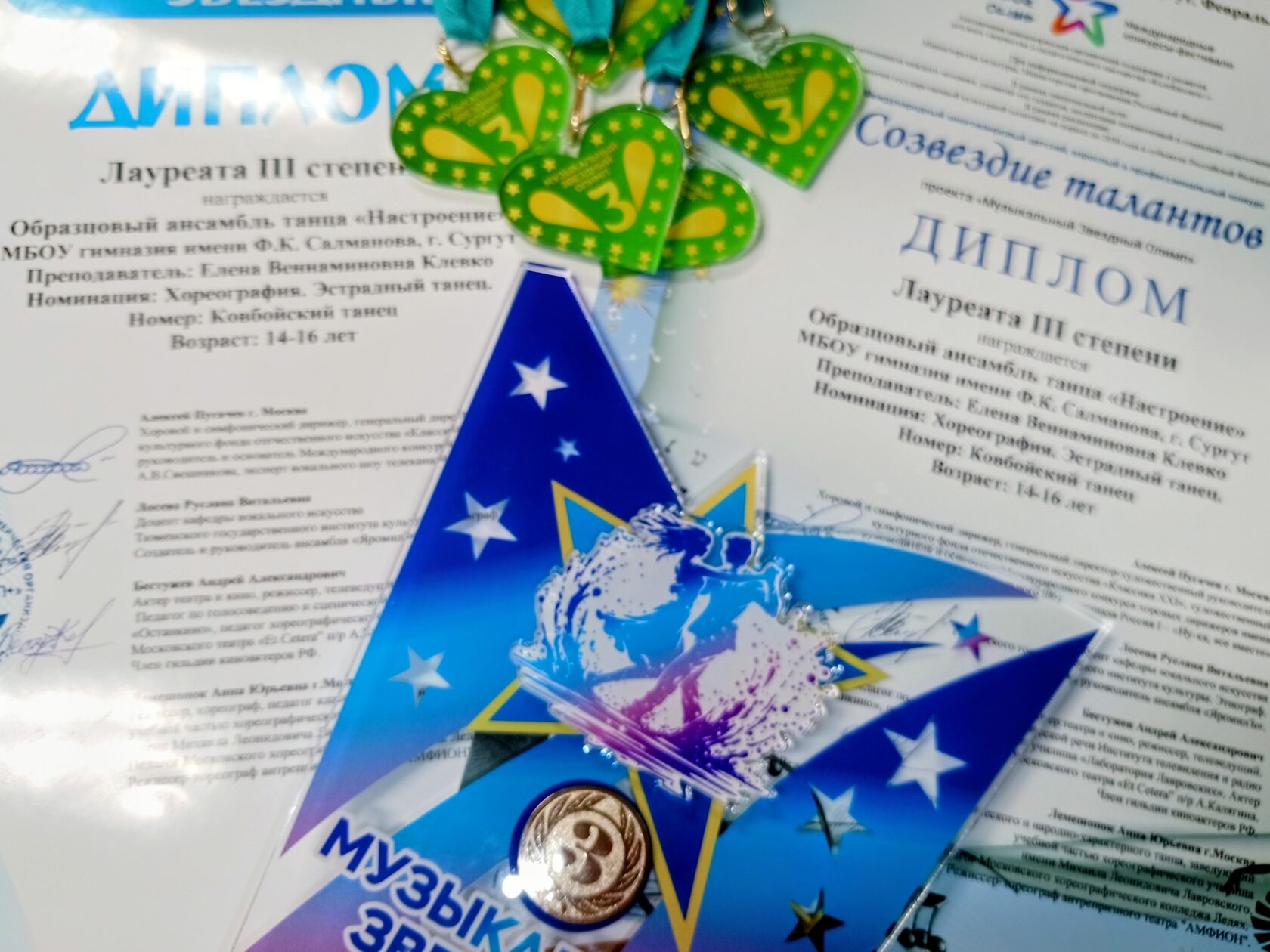 Лауреаты III степени в номинации «Эстрадный танец, малая форма» стал «Ковбойский танец» в исполнении средней группы девушек ансамбля: Парфёновой Ксении, Клепиковой Дарьи, Кочневой Анны, Мысовой Анны, Рутц Анны, Самсоновой Ульяны.