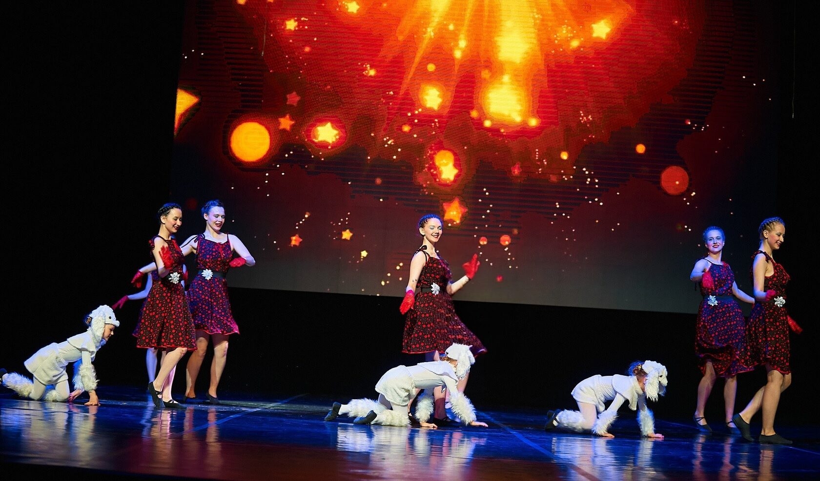 Зрительный зал очень активно и тепло поддерживал и аплодировал зажигательному танцу статных парней в количестве 5 человек и девушек-красавиц, а когда вышли «собачки» в исполнении маленьких артистов, зал взорвался бурными аплодисментами!