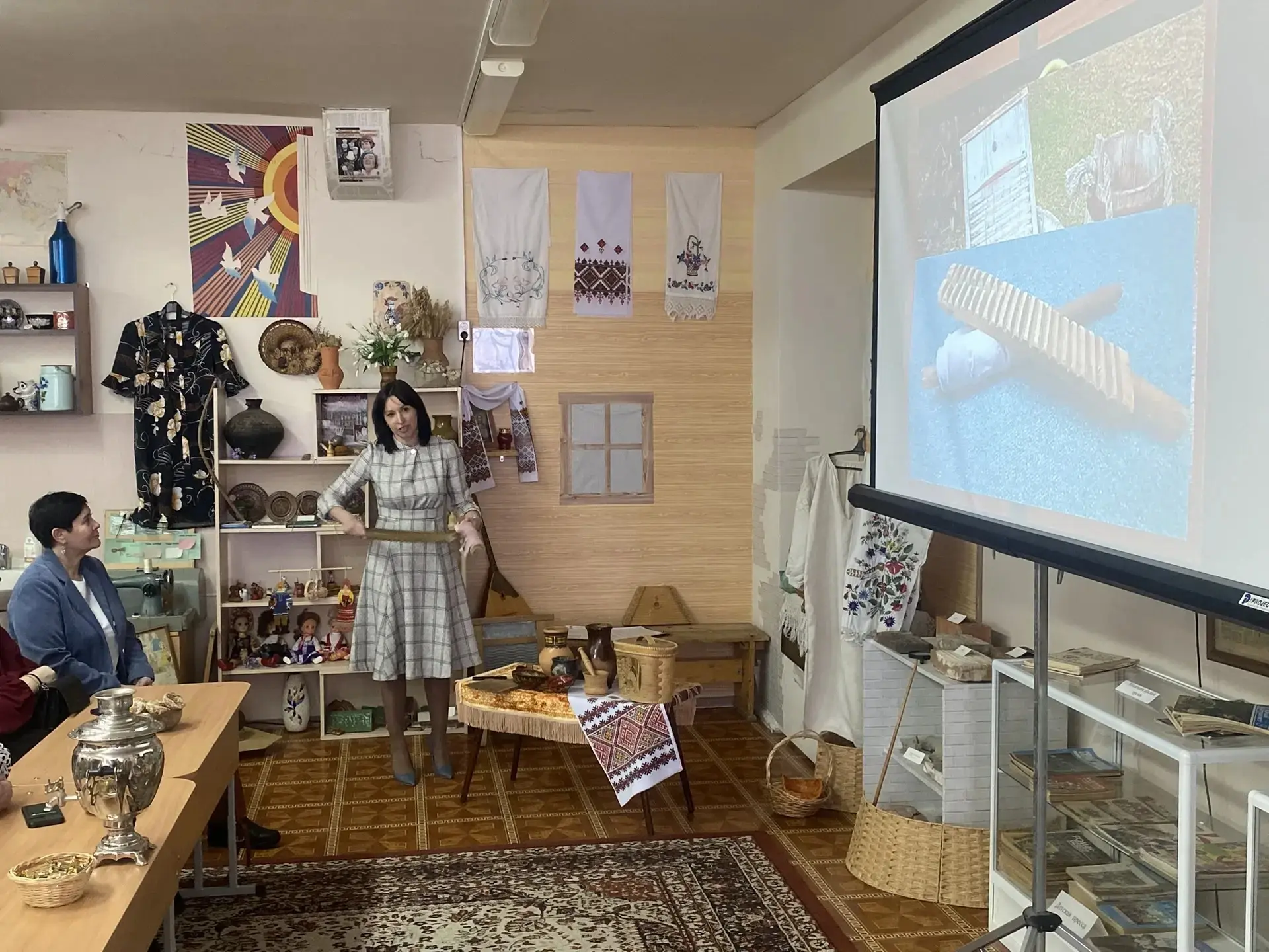 Учитель истории и обществознания, Билецкая Евгения Викторовна, рассказала об используемых материалах на уроке по теме «Русская изба», об особенностях интерьера и быта, а также о традициях, связанных с русской избой.