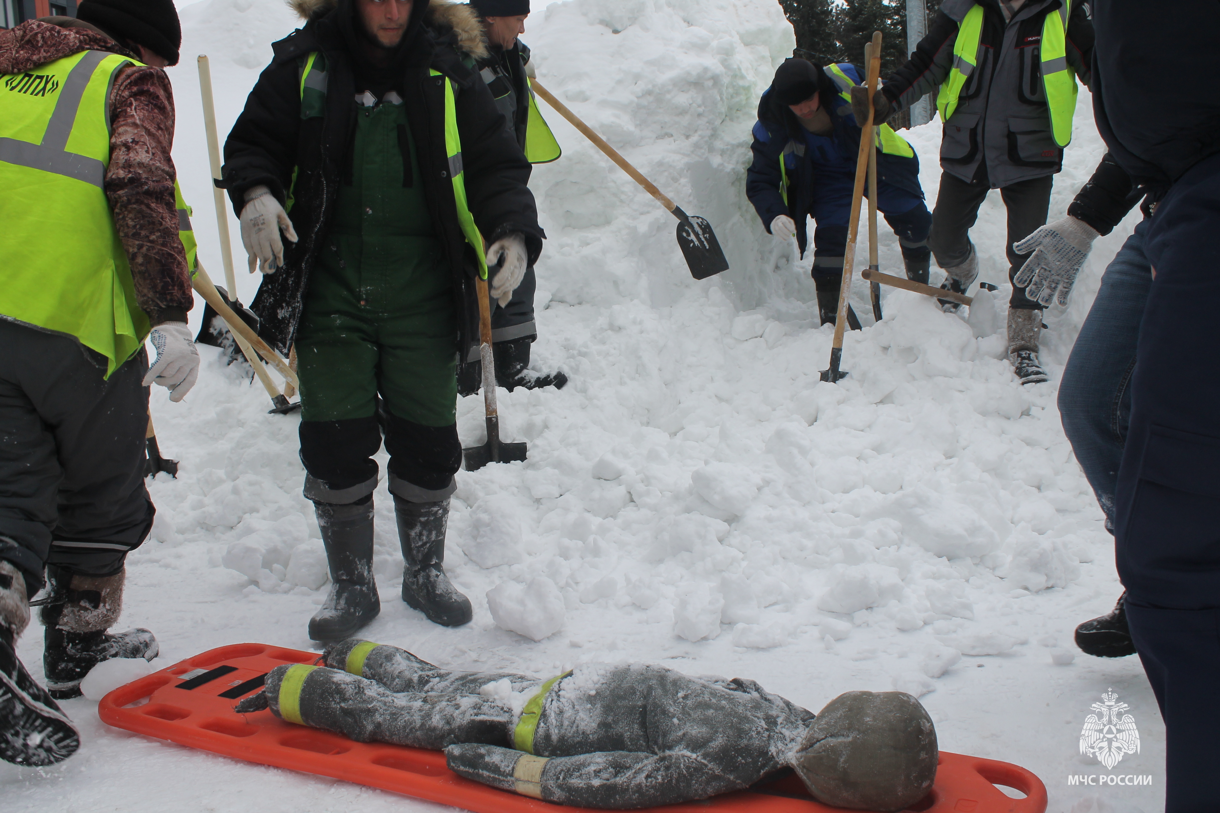 В ходе учении было отработано несколько вариантов проведения поисково-спасательных работ под снежными завалами: