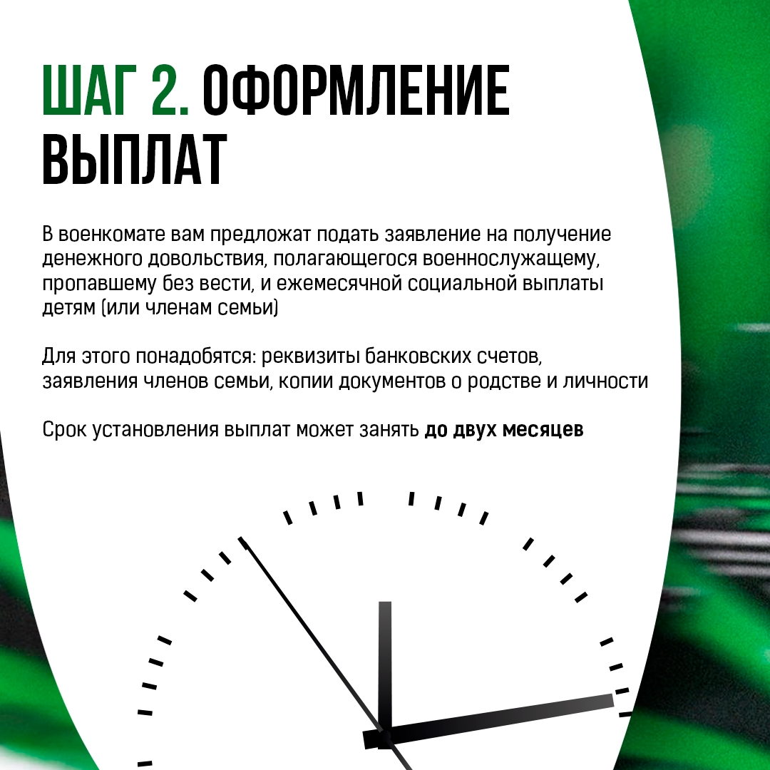 Шаг 2. Оформление выплат. В военкомате вам предложат подать заявление на получение денежного довольствия, полагающегося военнослужащему, пропавшему без вести, и ежемесячной социальной выплаты детям (или членам семьи). Для этого понадобятся: реквизиты банковских счетов, заявления членов семьи, копии документов о родстве и личности. Срок установления выплат может занять до двух месяцев.