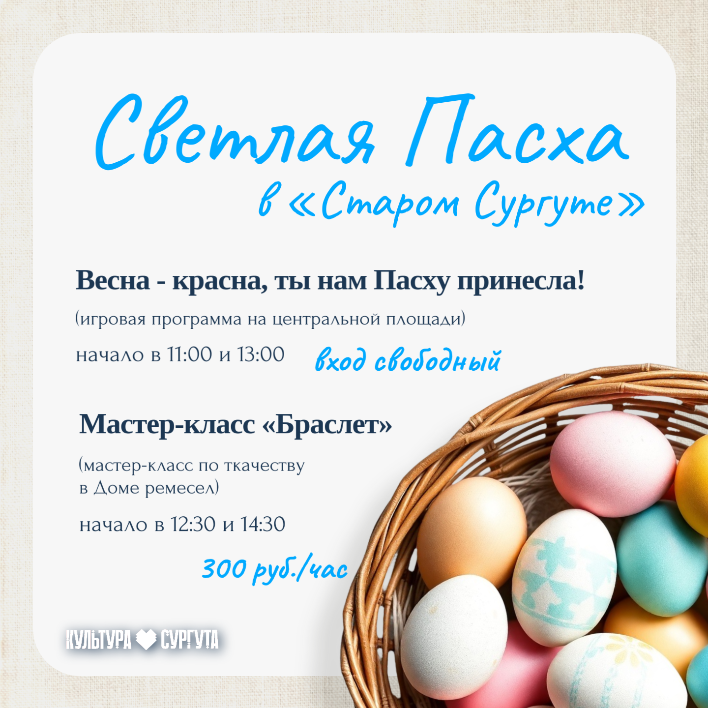 11.00-12.00, 13.00-14.00 – игровая площадка «Весна-Красна, ты нам Пасху принесла!» (центральная площадь);