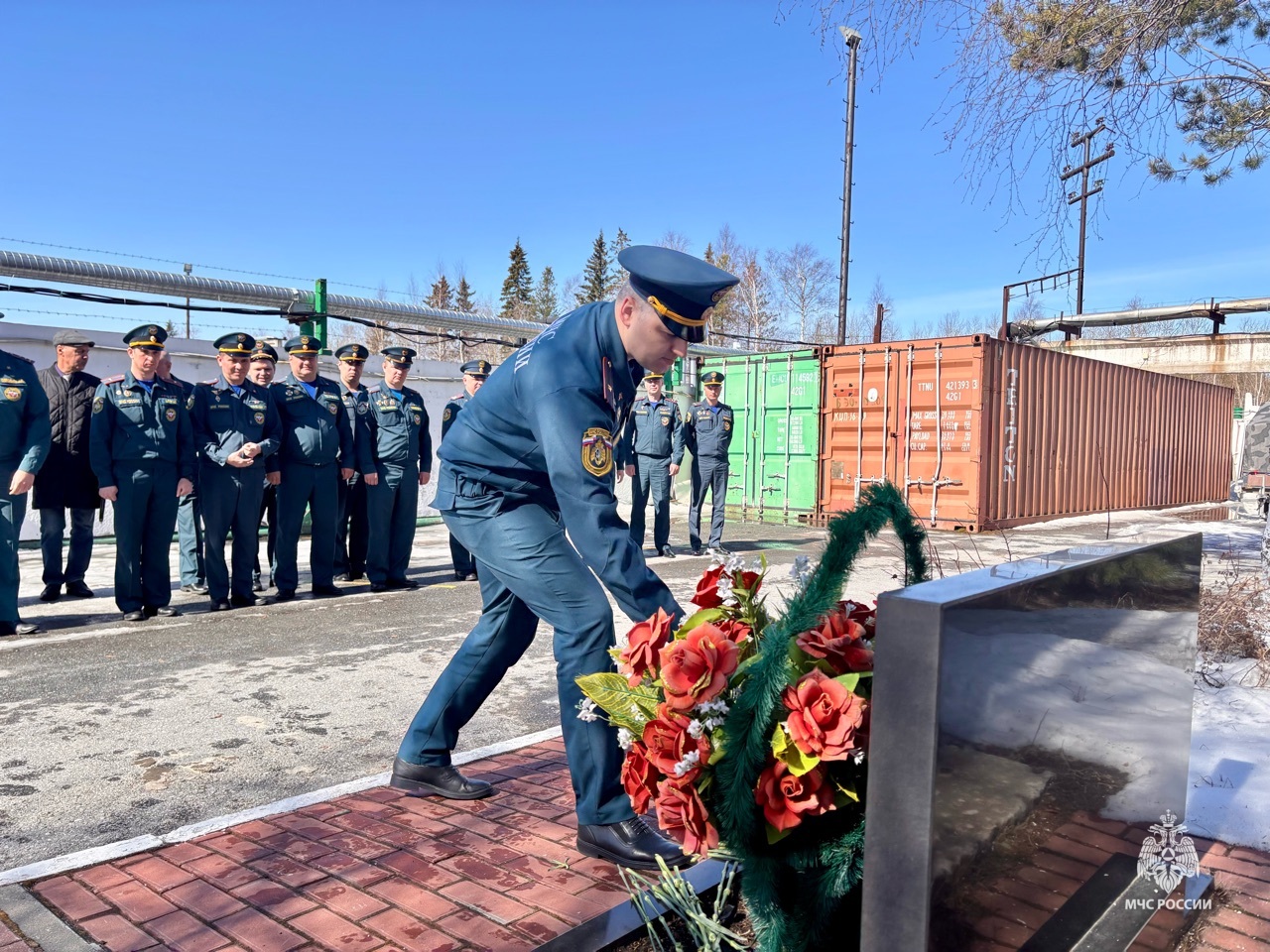 В городе Сургуте сотрудники МЧС России также собрались на митинг, почтили память погибших сослуживцев минутой молчания и возложили цветы к Памятному мемориалу, установленному в честь пожарных и спасателей, погибших при исполнении служебного долга.