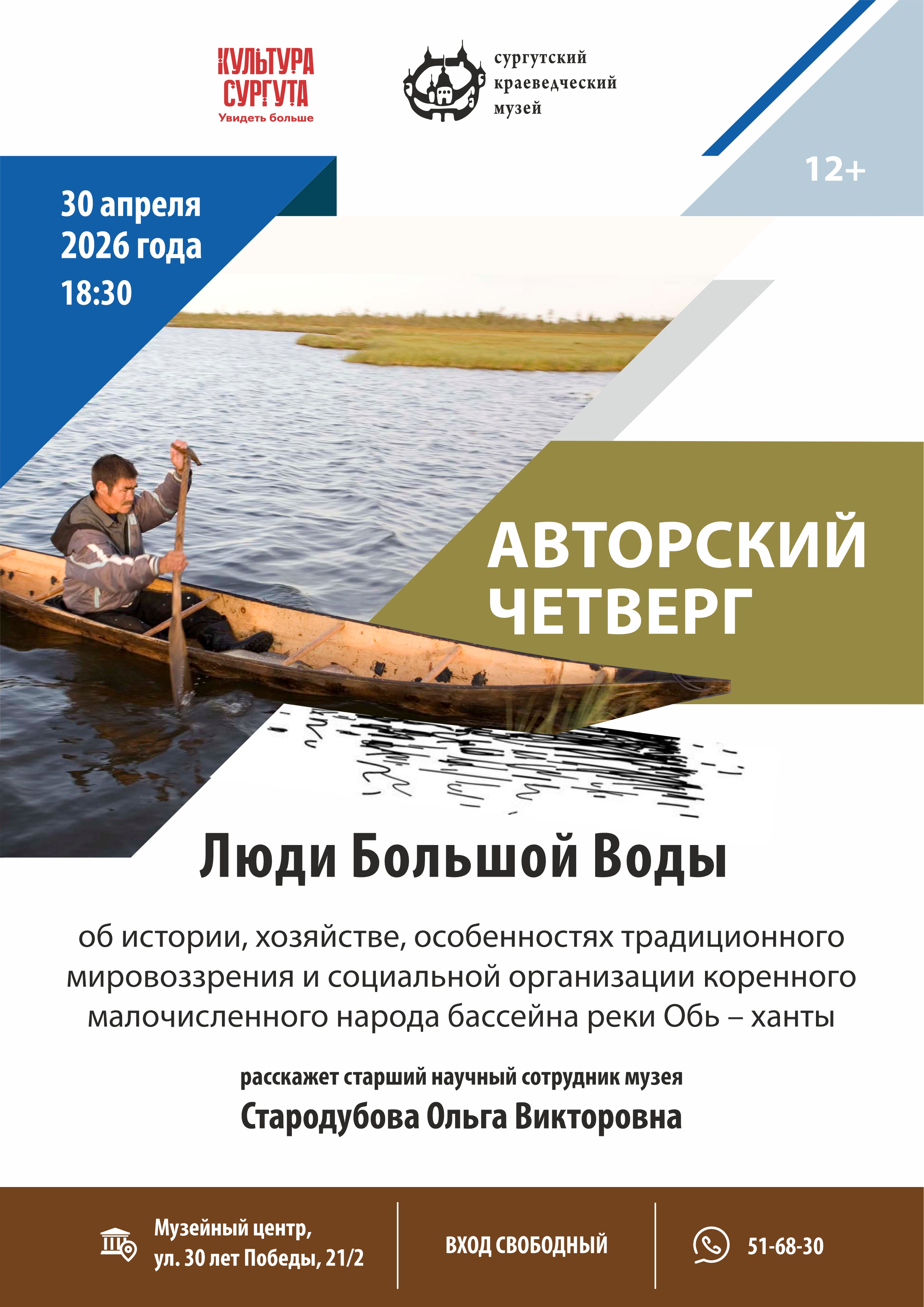 В ноябре 2025 года указом президента РФ Владимира Путина была утверждена дата празднования Дня коренных малочисленных народов Российской Федерации – 30 апреля. В этот день в Сургутском краеведческом музее в рамках просветительского проекта «Авторский четверг» пройдет лекция «Люди Большой Воды», посвященная истории и культуре народа ханты, проживающего в бассейне реки Обь («Ас», в переводе – «Большая вода»).